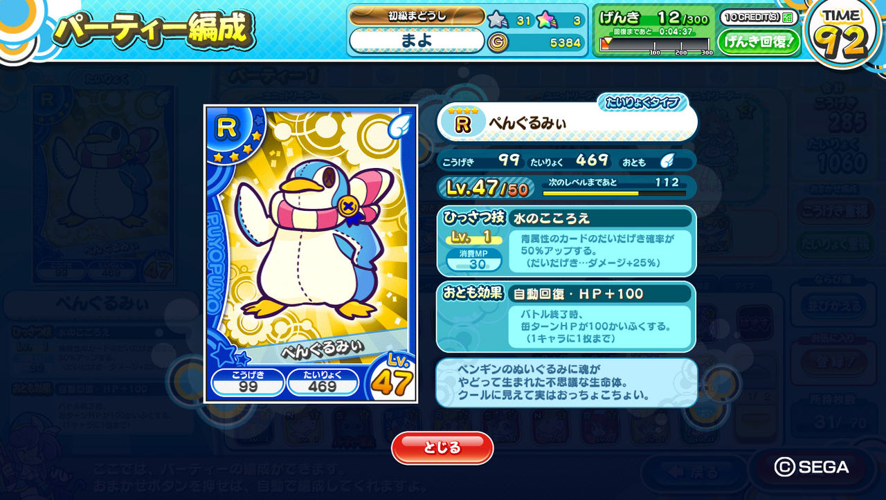 このキャラクターは「バトル終了時、毎ターンMPが5かいふくする」がおとも効果みたいね。